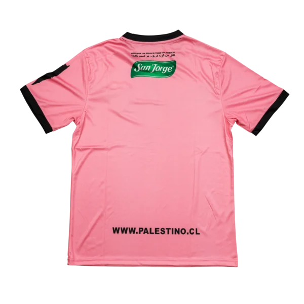 Schwarzes Club Deportivo Palestino Auswärtstrikot von Capelli Sport mit v-förmigem Flaggenmuster und Bank of Palestine Sponsorprint. San Jorge Rückenprint und mehrsprachigem Motto im Kragen, dazu weißer www.palestino.cl Schriftzug…